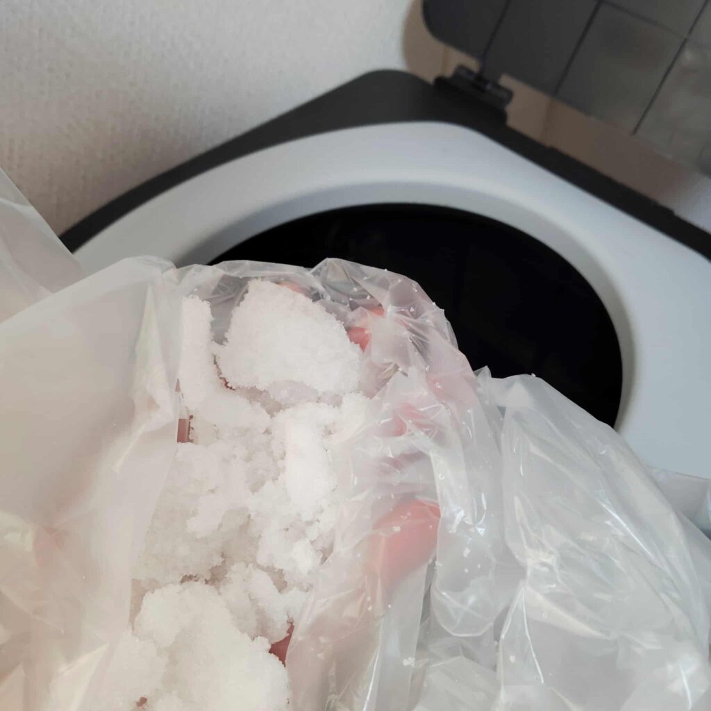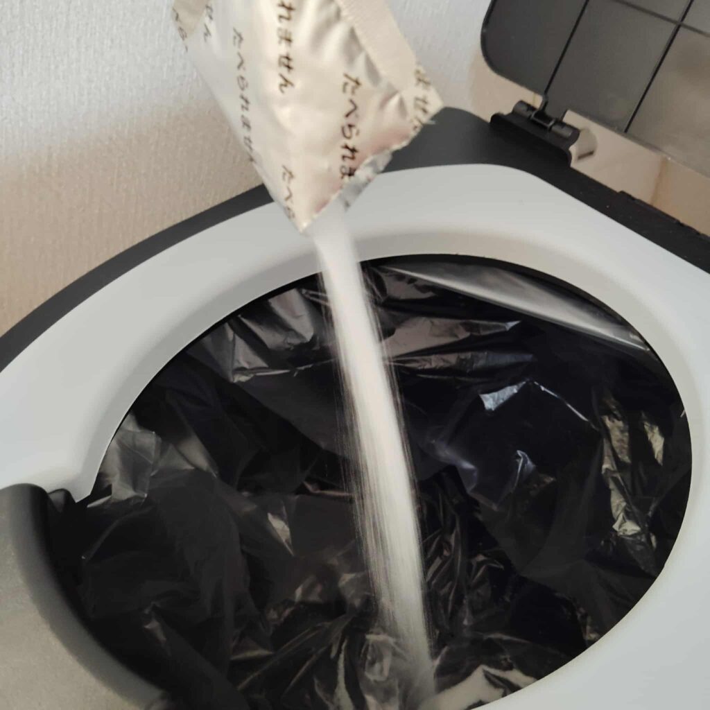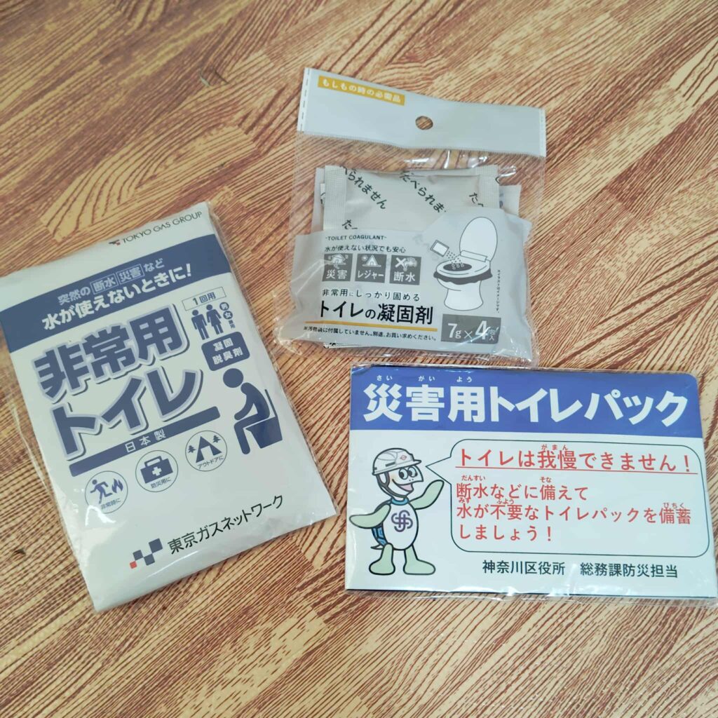 小さい子どものおしっこの量は少ないので、1回で1袋を捨てるのは勿体ないと思ったのですが、水分の量が多いと凝固しなくなるので、1人1袋が好ましいと防災担当の方が言っていました。