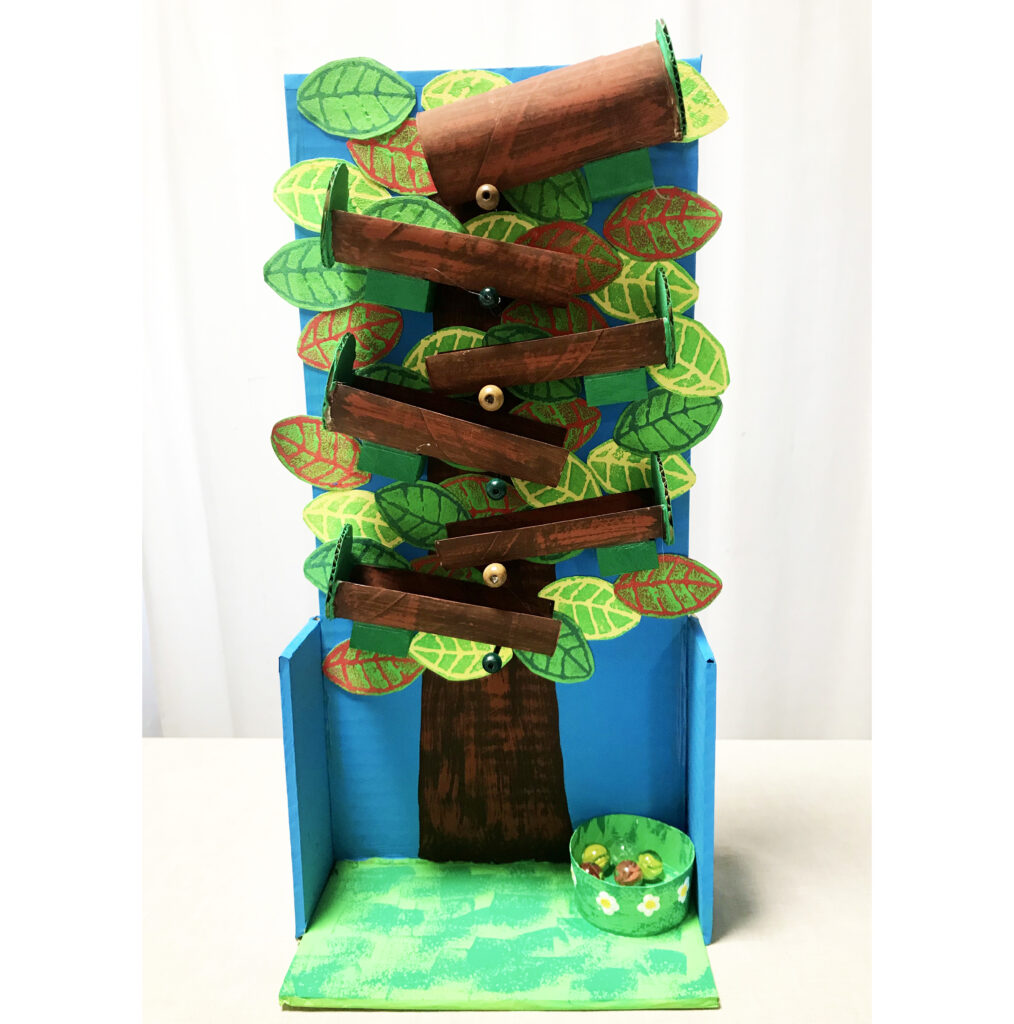 ベーシックアートクラスは、イングリッシュネイティブスピーカーの先生、日本人スタッフと一緒に、絵や立体作品を一緒に楽しみながら制作するクラスです。今回は、木の枝からビー玉がカラコロ落ちる、マーブルランを作ります。アンイーキッズに大人気の作品です。