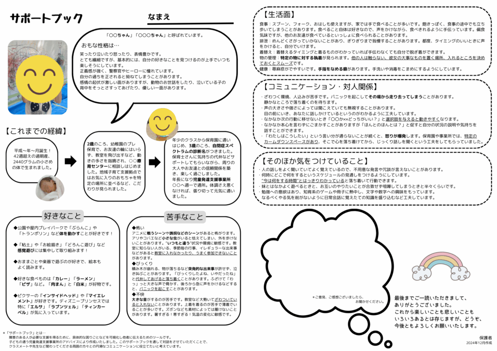 サポートブックは、お子さんの大切な個人情報です。年度末には回収する、処分してもらうなど、取り扱いには十分気をつけてください。