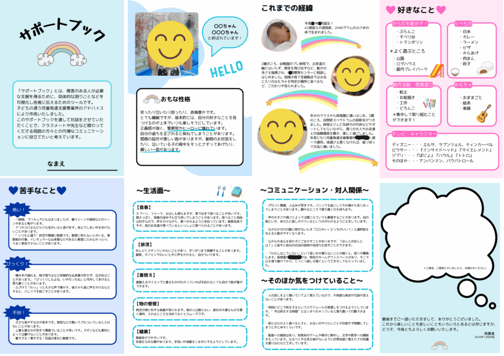 学校の先生に見てもらう場合など、年度毎に使うこともあるかもしれません。受け取る相手によって、サポートブックの扱い方も変わります。まずは、お互いに話しやすい方法で進めてみてください。要件ばかりではなく、子どもが好きなキャラクターやよく見るテレビ番組などの情報もいれておくと、お子さんと支援者との間で話しの種になることがあります。